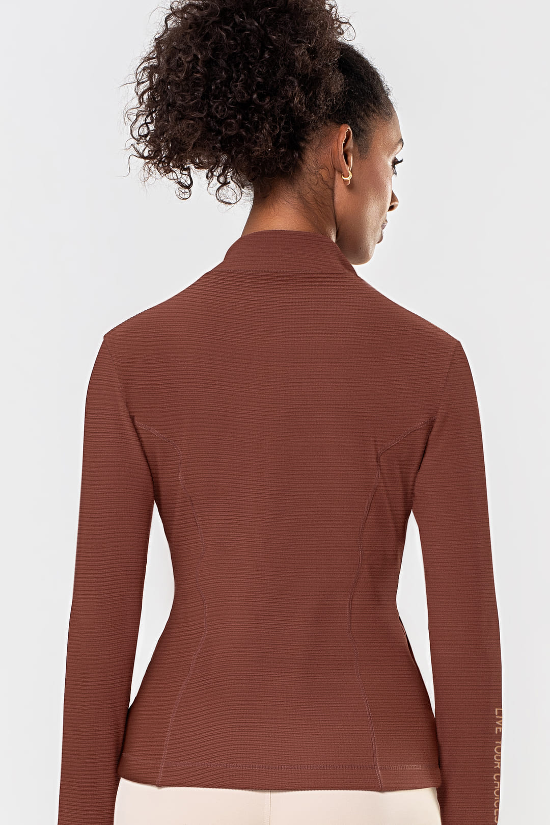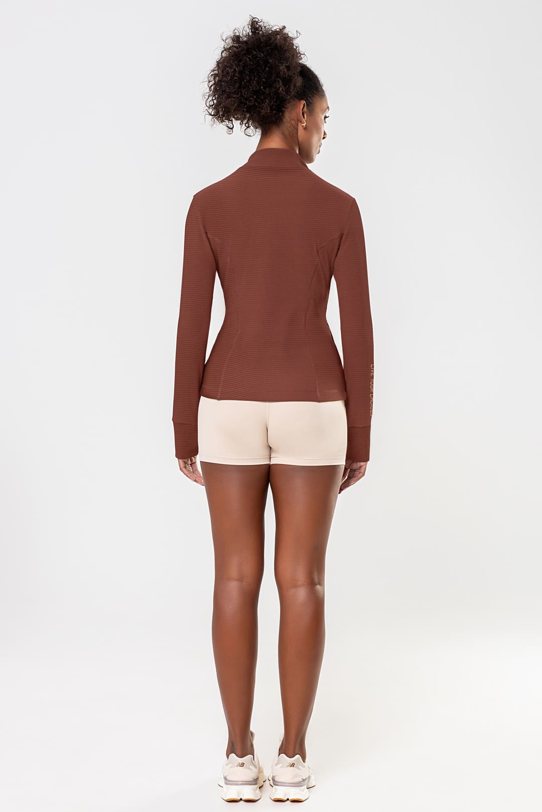 A gola alta com acabamento duplo adiciona estrutura ao visual, enquanto o zíper frontal no mesmo tom mantém a proposta clean e moderna. As mangas longas com abertura para os polegares aumentam a praticidade, reforçando o apelo funcional da peça.